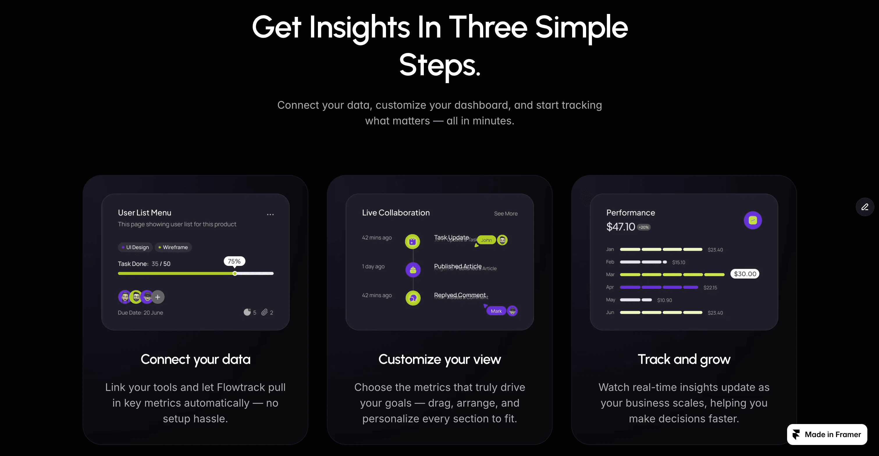 The final landing page presents FlowTrack as a clear and reliable analytics platform with a strong focus on usability and visual clarity. The design simplifies complex data concepts into an easy-to-navigate layout, creating a smooth first impression while guiding users toward key actions.